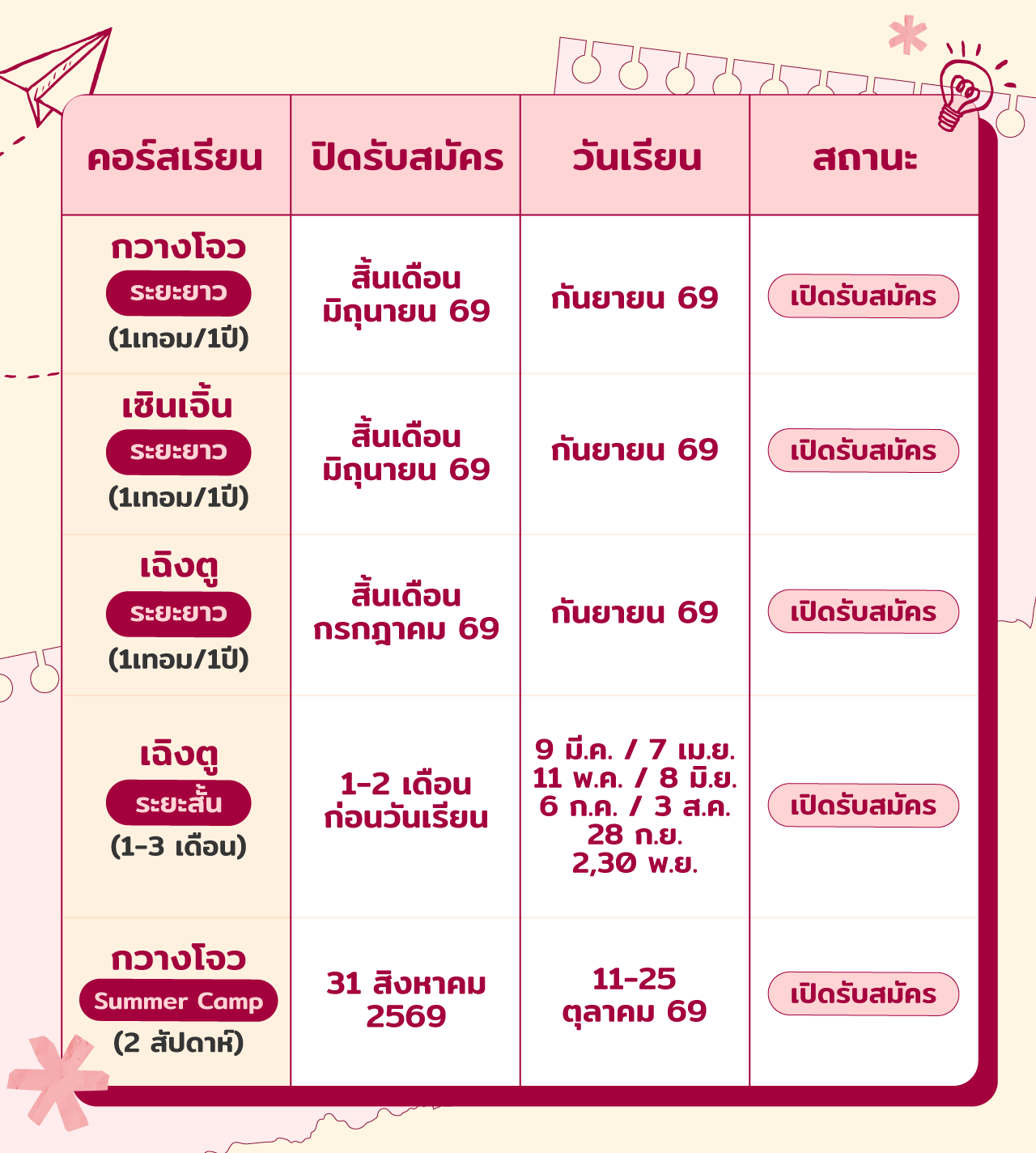 หลายคนฝันอยากไป เรียนภาษาจีนที่ประเทศจีน เพราะประเทศจีนเป็นหนึ่งในประเทศที่ระบบการศึกษาก้าวหน้า โตเร็วที่สุดด้านธุรกิจ เทคโนโลยีและค่าครองชีพไม่สูงมาก การ เรียนภาษาจีนที่ประเทศจีน ไม่ได้มีแค่ระดับปริญญา แต่ยังมีคอร์สเรียนภาษาจีน สำหรับผู้เริ่มต้นที่อยาก เรียนภาษาจีนที่ประเทศจีน แบบปูพื้นฐานก่อน ตัดสินใจ เรียนประเทศจีน อย่างจริงจัง ถ้าอยากพัฒนาทักษะการสื่อสารให้พูดได้ไว การ เรียนภาษาจีนที่ประเทศจีน คือทางเลือกที่ดีที่สุด เพราะได้ฝึกพูด ฟัง และใช้ภาษาในชีวิตประจำวันกับเจ้าของภาษาโดยตรง สำหรับใครที่ยังไม่รู้จะเริ่ม เรียนประเทศจีน ยังไง? กำลังมองหา เอเจนซี่เรียนต่อจีน อยู่? NextGate เอเจนซี่เรียนจีน ที่ดูแลครบทุกขั้นตอนสำหรับผู้ที่ต้องการ เรียนประเทศจีน ทั้งคอร์สระยะสั้นและระยะยาว ให้ NextGate เอเจนซี่เรียนต่อจีน ช่วยให้ทุกขั้นตอนของคุณง่ายขึ้น เพราะเราช่วยตั้งแต่เลือกมหาวิทยาลัย ยื่นเอกสาร เตรียมตัวก่อนเดินทาง ไปจนถึงการดูแลที่จีน เรียนประเทศจีน ไม่ต้องห่วง Nextgate เอเจนซี่เรียนจีน ที่ดูแลครบวงจร เหมาะกับทั้งนักเรียนมัธยม นักศึกษา และคนทำงานที่อยาก เรียนภาษาจีนที่ประเทศจีน เพื่อเพิ่มโอกาสในสายอาชีพ หรือฝึกภาษาเพื่อต่อยอดในอนาคต