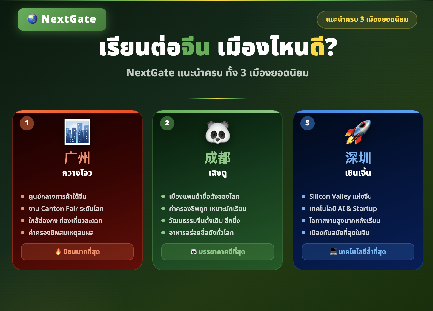 คำถามยอดฮิตจากน้องๆ คือ เรียนต่อประเทศจีน เมืองไหนดี NextGate จึงรวบรวมข้อมูลเปรียบเทียบ 3 เมืองหลักที่เราเปิดโปรแกรมอยู่ เพื่อช่วยให้คุณตัดสินใจได้ว่าจะเรียนต่อประเทศจีน ที่ไหนดีที่สุดสำหรับคุณ